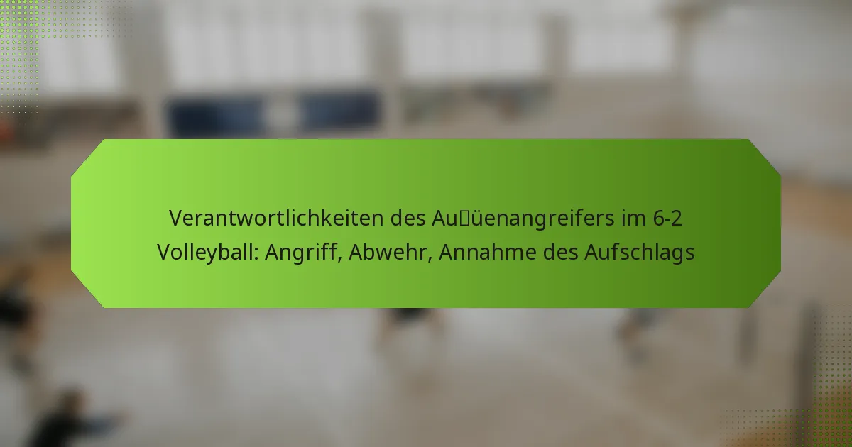 Die Kernverantwortlichkeiten eines Außenangreifers in einem 6-2 Volleyballsystem umfassen das Angreifen, Verteidigen und die Teilnahme am Annahmespiel. Diese Position ist sowohl für offensive Spielzüge als auch für defensive Strategien von entscheidender Bedeutung und erfordert ein vielseitiges Fähigkeiten-Set, um sich an verschiedene Spielsituationen anzupassen.